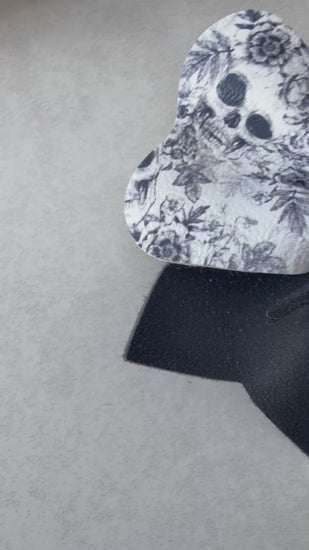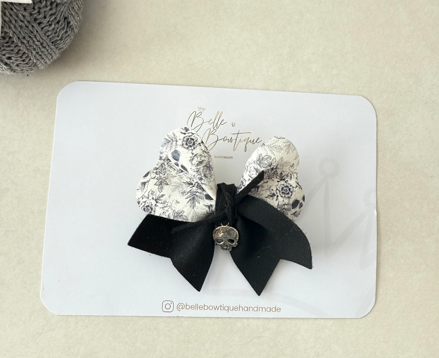Black & White Halloween Bow Clip– Skull Print Bow with Charm