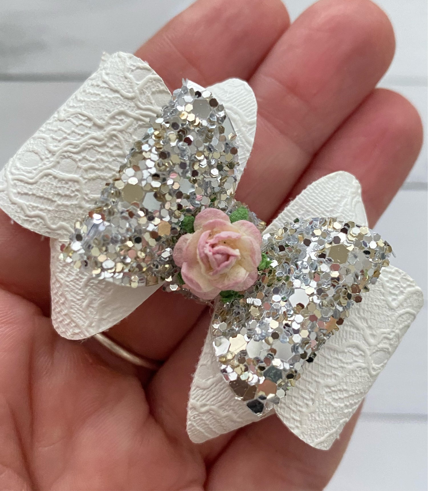 Gorgeous off white lace bow with glitter bow top. Finished with a perfect bi-colour rose.