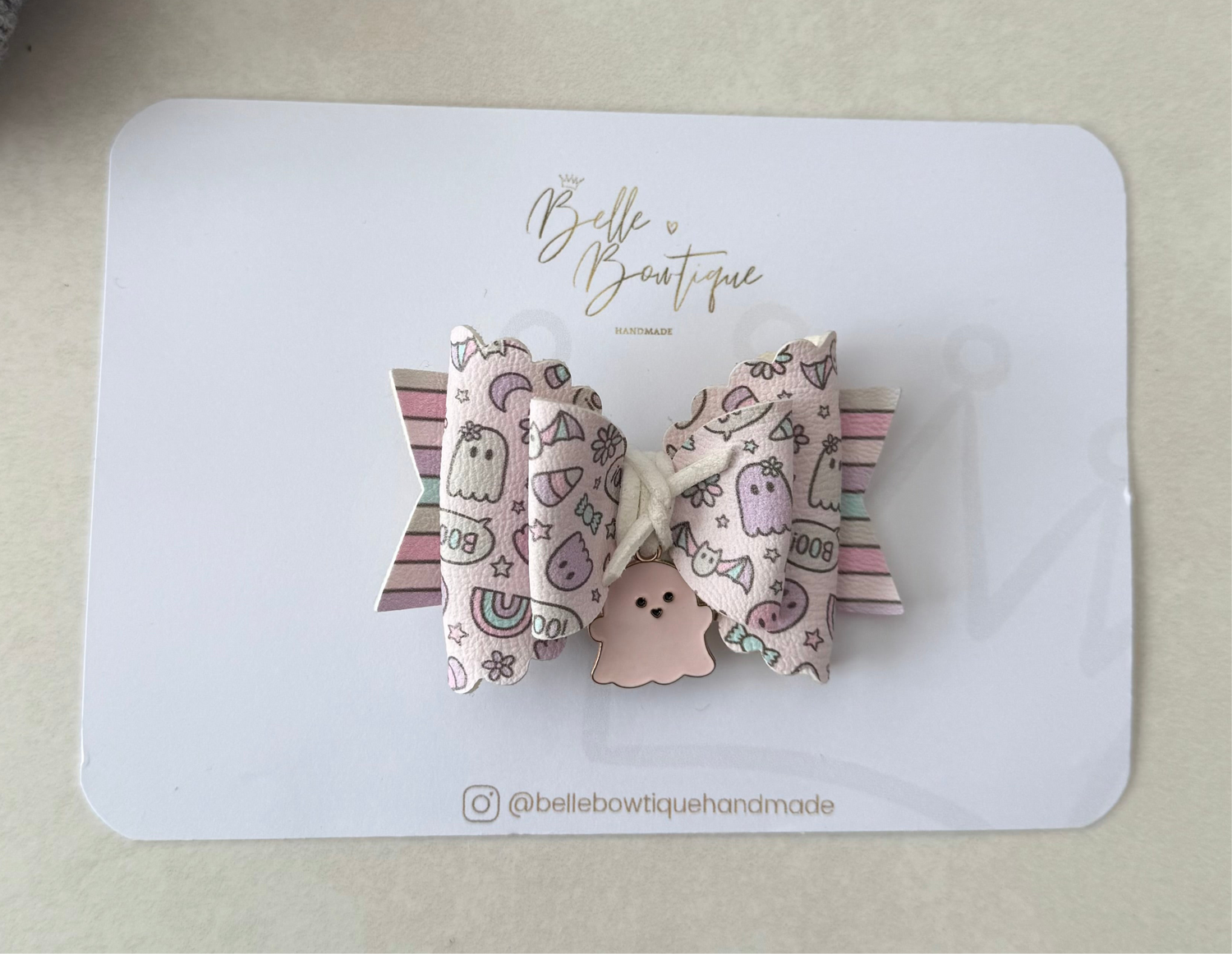 Purple and Pink Halloween Hair Bow – Cute Ghost Print Bow with Matching Ghost Charm