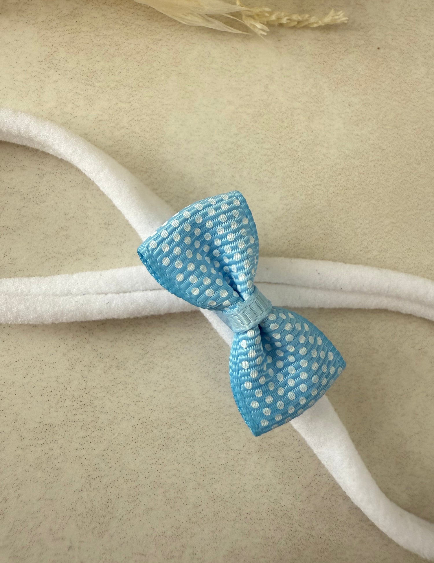 Blue and white spotty bow on a matching white headband. Small now so not overpowering. Fits from newborn onwards.